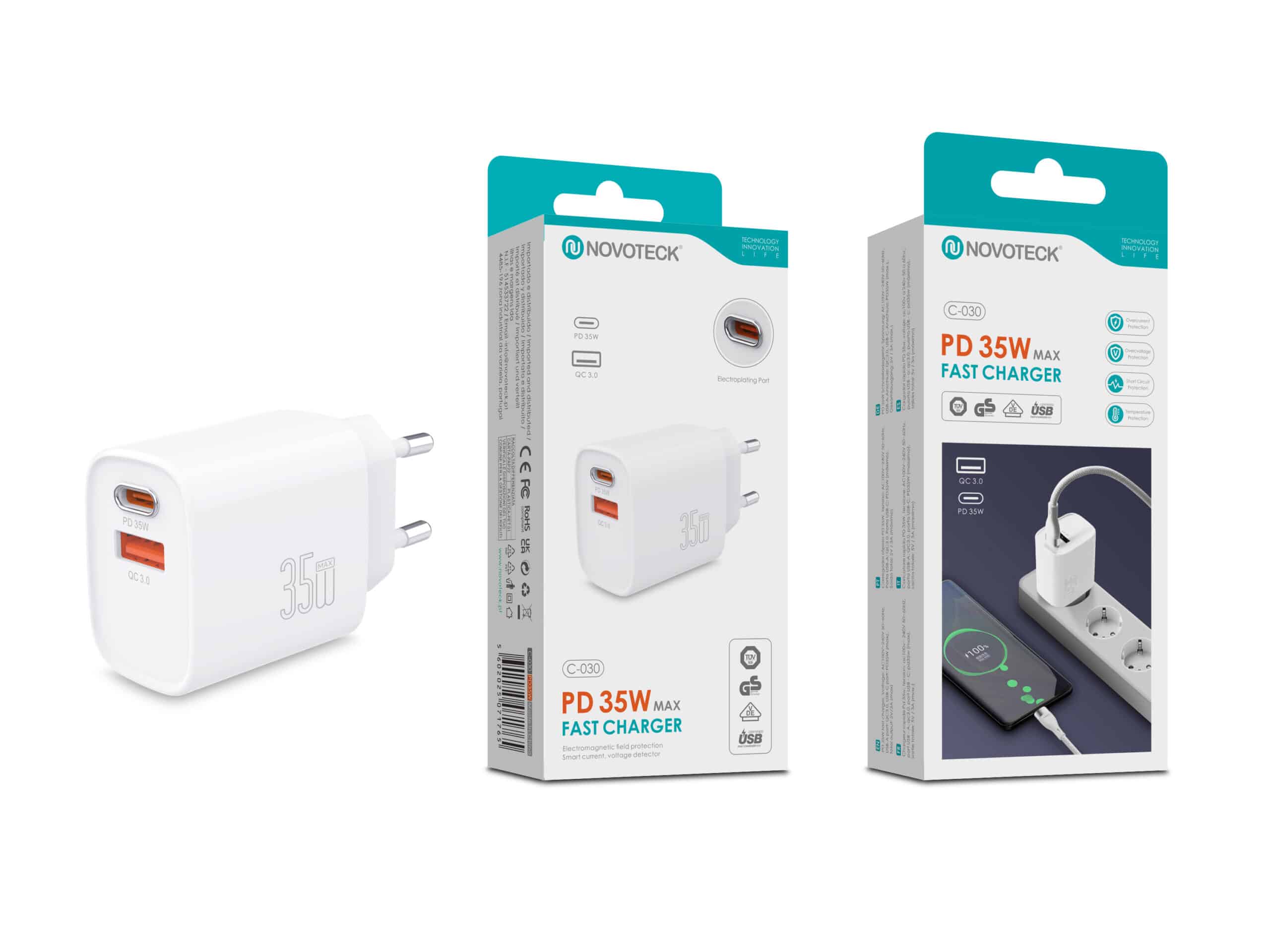 O C-030 é um carregador rápido e eficiente que conta com duas saídas: USB-C (PD) e USB-A (QC 3.0), garantindo compatibilidade com diversos dispositivos e fornecendo até 35W de potência máxima.